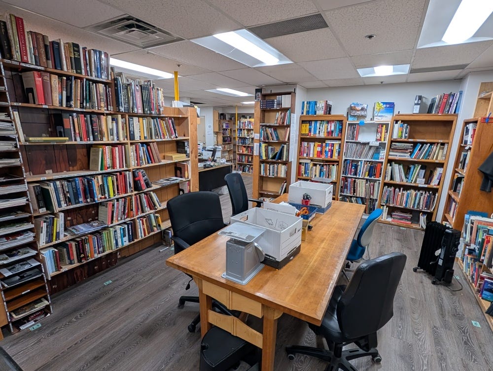 We walk the stacks, filled with donated used books and spine-shiny new ones, as Kris ticks off the types of books most requested. In genre fiction, it’s thrillers, sci-fi, fantasy, horror, urban and westerns.